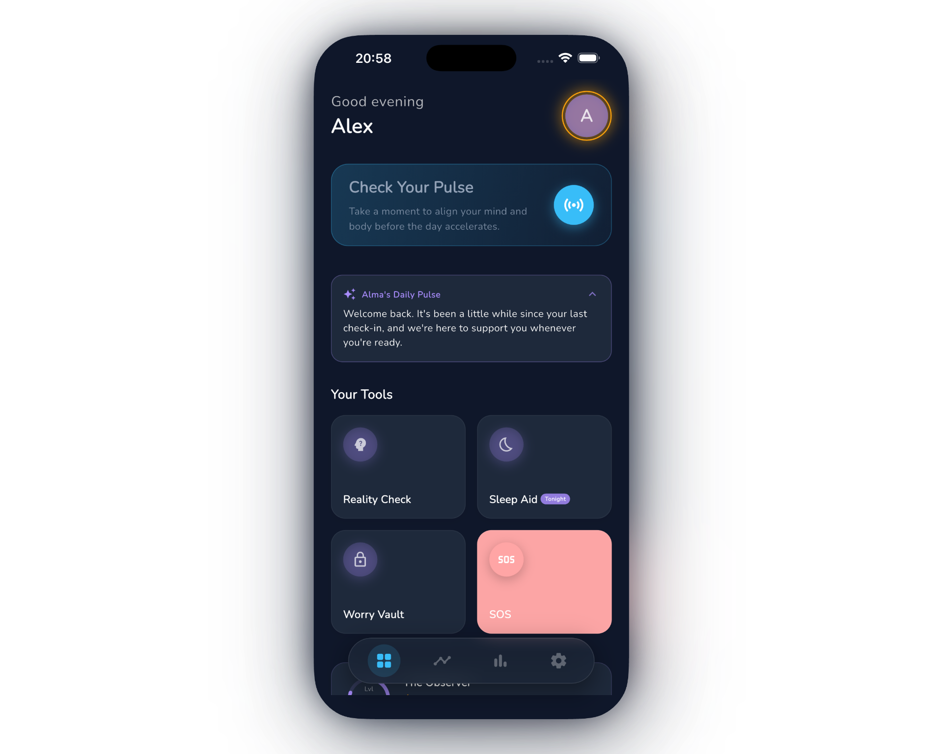 From urgent grounded breathing protocols to deep journaling spaces, Alumea’s dashboard proactively reconfigures itself to serve the exact psychological tool you need to stabilize in the moment.